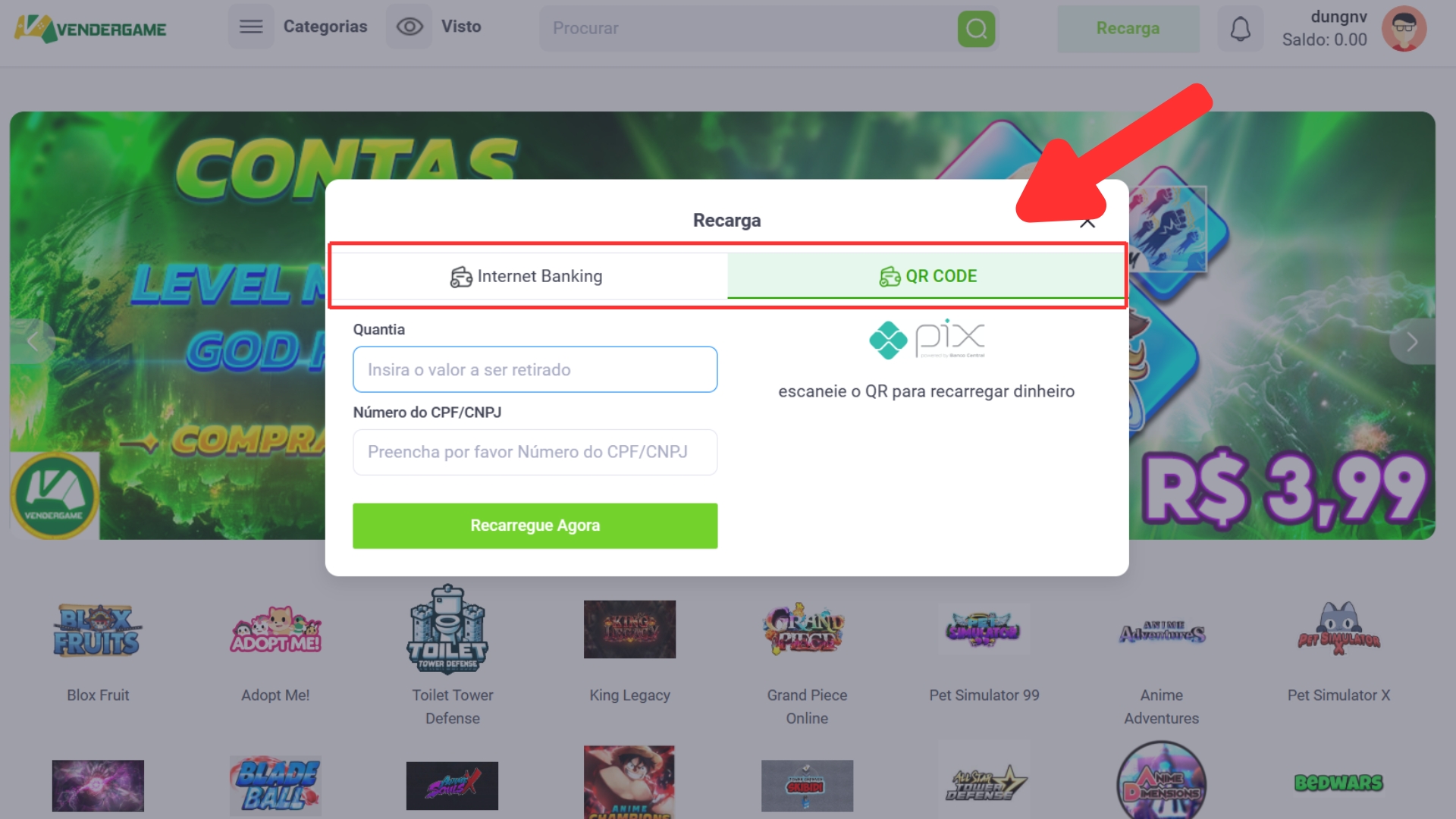 Passo 2: Escolha a forma de pagamento e o valor que deseja depositar e proceda ao pagamento. Quando bem sucedido, o dinheiro será adicionado à sua conta Vendergame imediatamente.