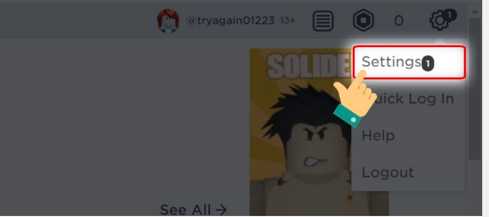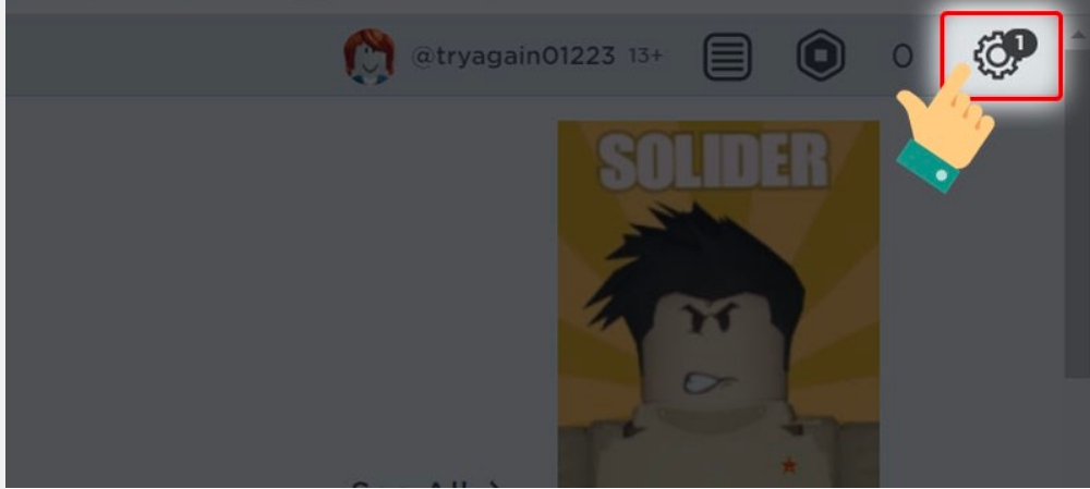 Passo 1: Acesse sua conta Roblox na interface da página inicial. Clique no ícone de engrenagem no canto direito da tela.
